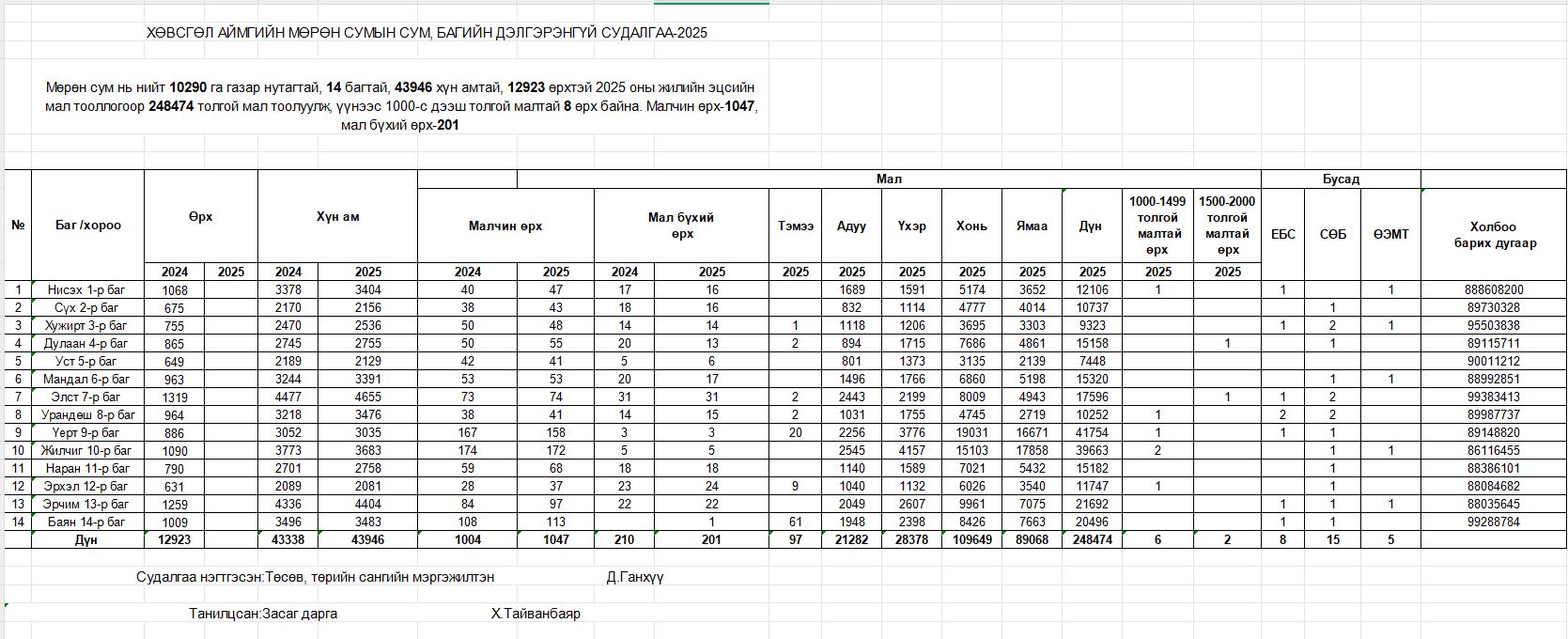 ХӨВСГӨЛ АЙМГИЙН МӨРӨН СУМЫН СУМ, БАГИЙН ДЭЛГЭРЭНГҮЙ СУДАЛГАА-2025
