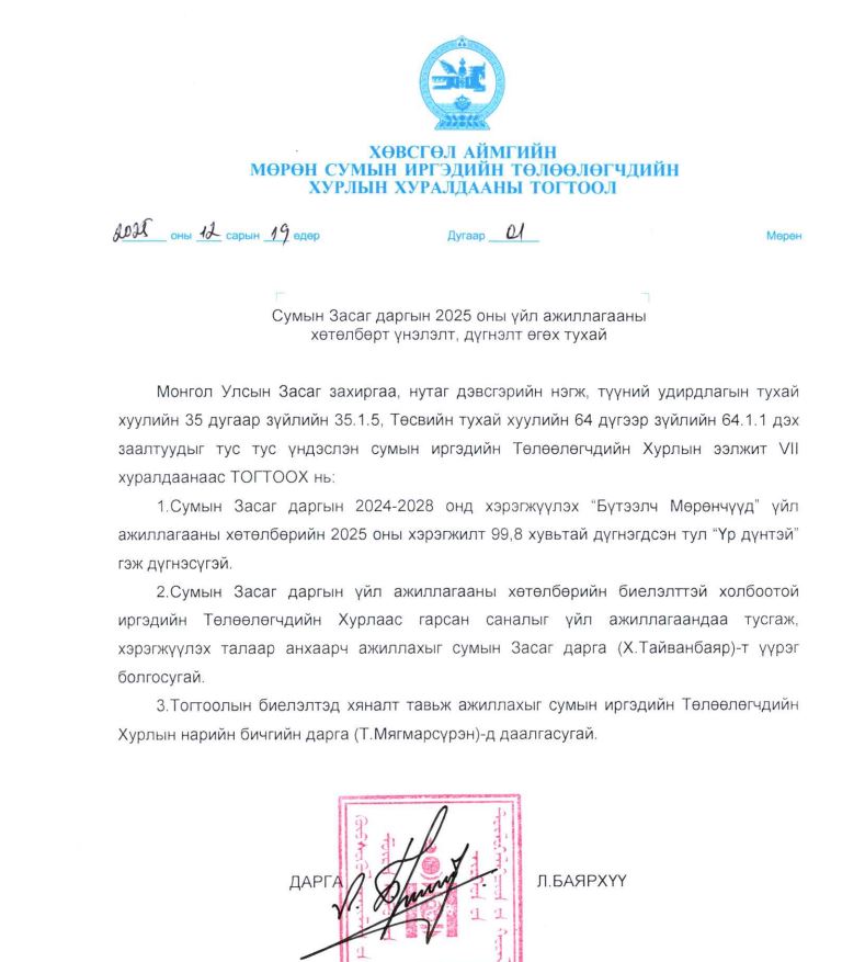 Сумын Засаг даргын 2025 оны үйл ажиллагааны хөтөлбөрт үнэлэлт, дүгнэлт өгөх тухай ИТХ тогтоол