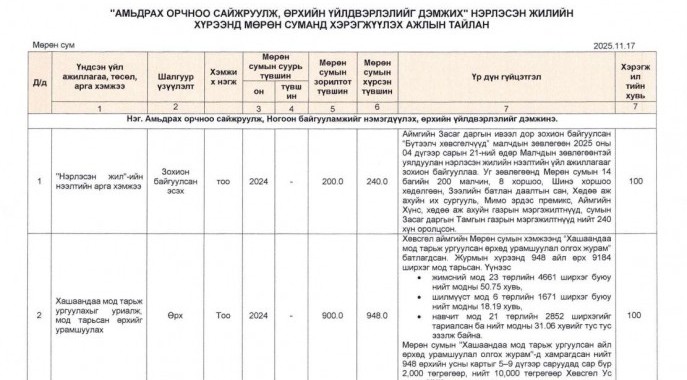 "АМЬДРАХ ОРЧНОО САЙЖРКРУУЛЖ, ӨРХИЙН ҮЙЛДВЭРЛЭЛИЙГ ДЭМЖИХ" НЭРЛЭСЭН ЖИЛИЙН ХҮРЭЭНД МӨРӨН СУМАНД ХЭРЭГЖҮҮЛЭХ АЖЛЫН ТАЙЛАН...