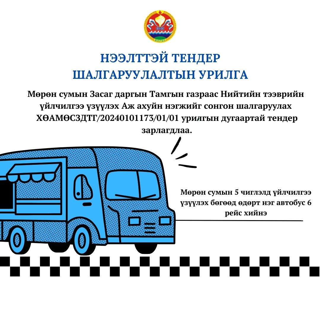 МӨРӨН СУМЫН ЗАСАГ ДАРГЫН ТАМГЫН ГАЗРААС НИЙТИЙН ТЭЭВРИЙН ҮЙЛЧИЛГЭЭ ҮЗҮҮЛЭХ АЖ АХУЙН НЭГЖИЙГ СОНГОН ШАЛГАРУУЛАХ НЭЭЛТТЭЙ ТЕНДЕР ЗАРЛАГДЛАА
